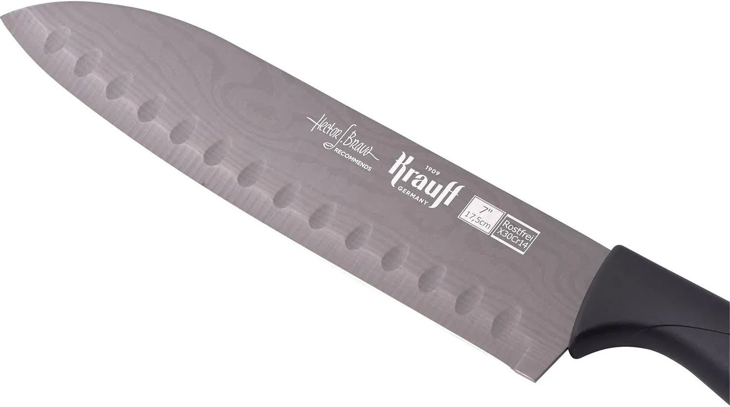 Ніж Santoku Smart Chef 17,5 см — універсальний помічник для щоденного приготування. Лезо з високоякісної сталі X30Cr14 забезпечує бездоганну гостроту, довговічність і стійкість до корозії, а ергономічна рукоятка з soft-touch покриттям гарантує зручність і надійний хват навіть під час тривалої роботи. Елегантний дизайн і збалансована форма роблять цей ніж ідеальним вибором для кухарів, які цінують ефективність, комфорт і стиль.