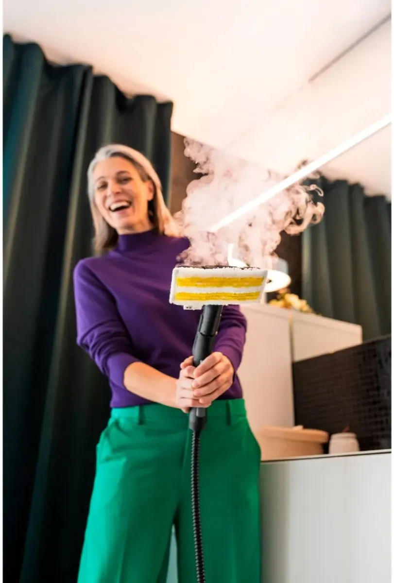 У комплект входить насадка для підлоги EasyFix з шарніром і мікрофіброва серветка, що забезпечують ретельне очищення. Гнучка ручна насадка дозволяє легко обробляти як плоскі, так і вигнуті поверхні, видаляючи навіть стійкі забруднення.