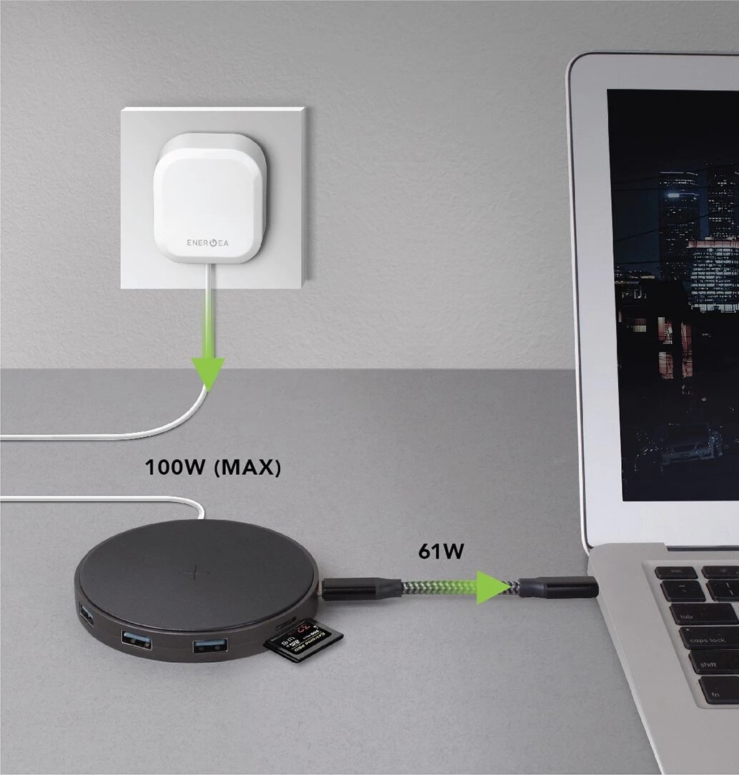Хаб оснащений двома портами USB Type-C. Перший працює тільки на вхід (до 100 Вт), а другий – на вхід і вихід. Це дозволяє під’єднати до Energea WiHub мережевий адаптер, щоб заряджати ноутбук з потужністю до 61 Вт. Прийшовши додому, вам буде достатньо під’єднати до лептопа лише один кабель, одночасно отримавши доступ до приєднаної до хабу периферії та швидкісної зарядки.