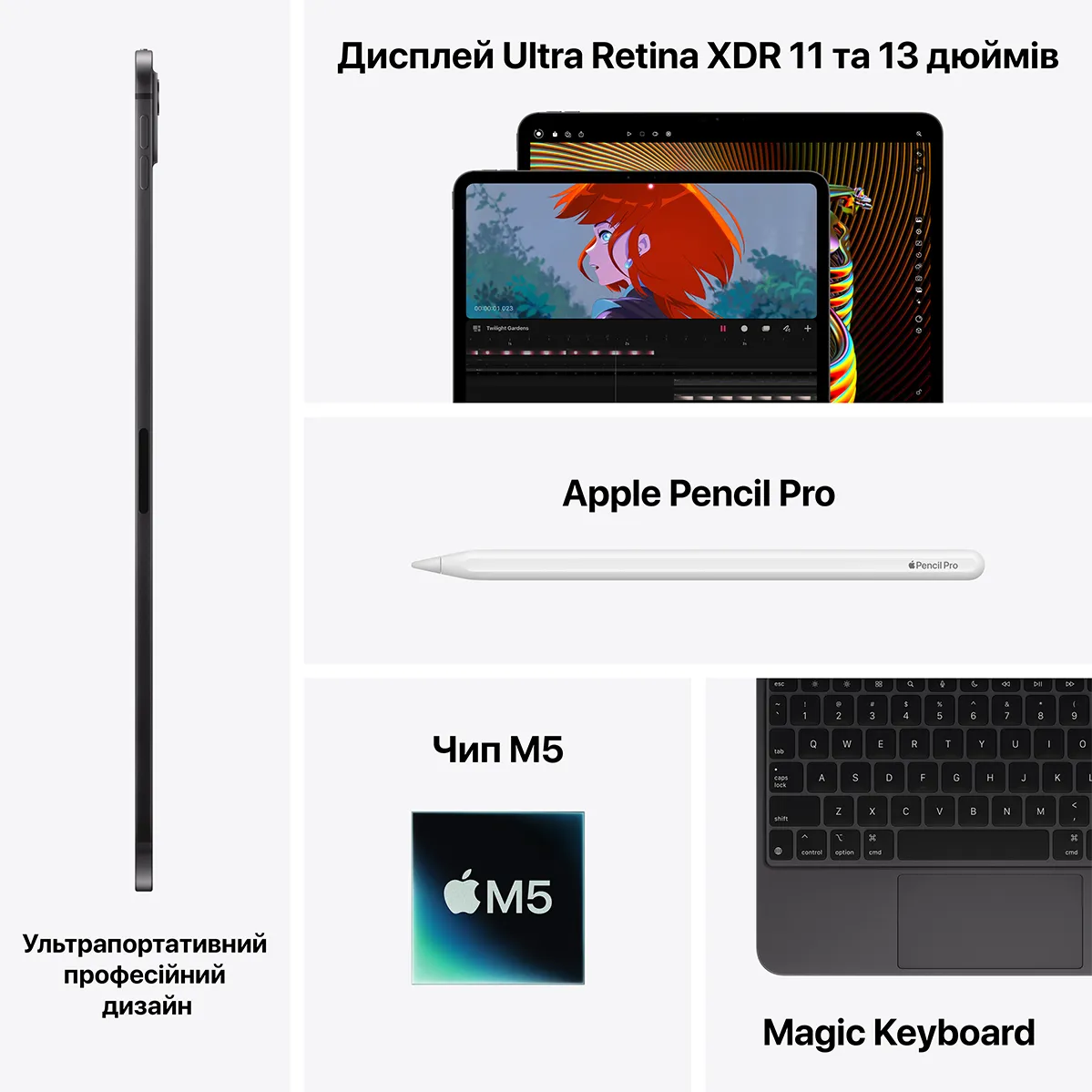 iPad Pro, оснащений чипом М5 від Apple, забезпечує надзвичайну продуктивність для легкої роботи та вдосконалених робочих процесів на основі штучного інтелекту. Завдяки приголомшливому дисплею Ultra Retina XDR, надшвидкому Wi-Fi 71 і підтримці 5G,2 прискорювачам Neural Accelerator для оброблення завдань штучного інтелекту й оновленій операційній системі iPadOS можливості iPad Pro необмежені. У парі з Apple Pencil Pro та клавіатурою Magic Keyboard для iPad Pro він забезпечує неймовірну універсальність, креативність і продуктивність у ваших руках.