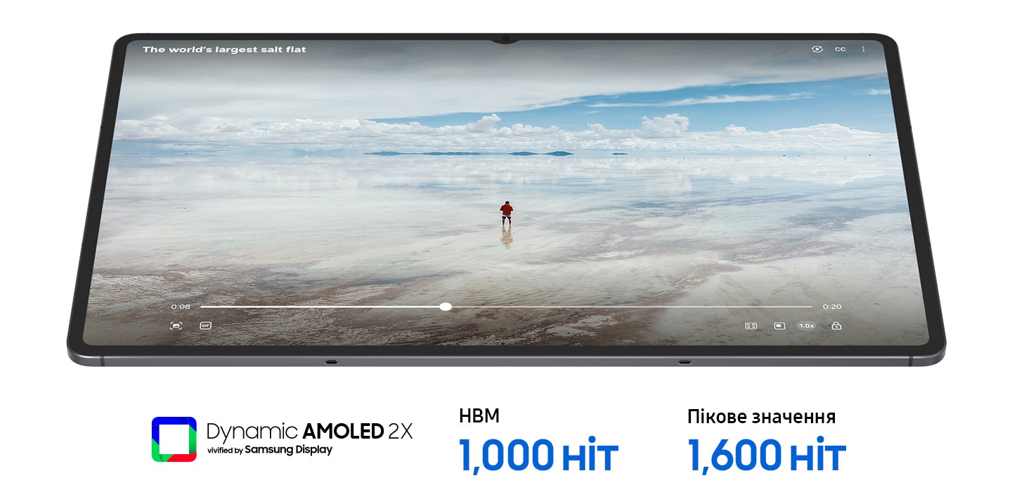 *Доступність моделі може відрізнятися залежно від країни, регіону та оператора зв'язку. *Розмір екрана Galaxy Tab S11 Ultra становить 14,6 дюйма, якщо вимірювати за діагоналлю повного прямокутника, і 14,7 дюйма з урахуванням заокруглення кутів. Фактична площа огляду менша через заокруглені кути та отвір камери. *Galaxy Tab S11 Ultra має максимальну яскравість 1 600 ніт і 1 000 ніт на вулиці в режимі високої яскравості.