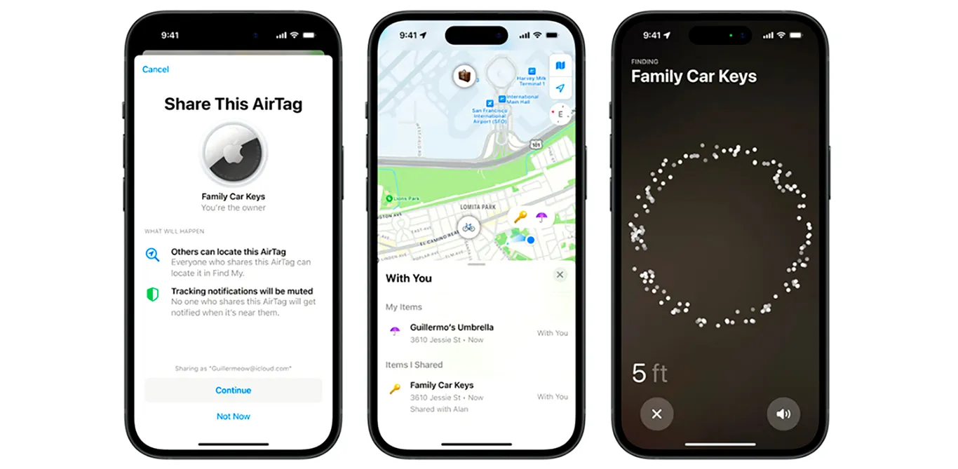 Більше не потрібно питати: «Де ключі від машини?». З функцією спільного доступу ви можете поділитися даними AirTag одразу з п'ятьма користувачами. Тепер друзі та близькі можуть бачити спільні речі — чи то велосипед, парасольку або дорожній рюкзак — прямо у своєму застосунку «Локатор». Кожен учасник групи отримує актуальні координати в реальному часі, перетворюючи пошук речей на просте та скоординоване завдання для всієї компанії.