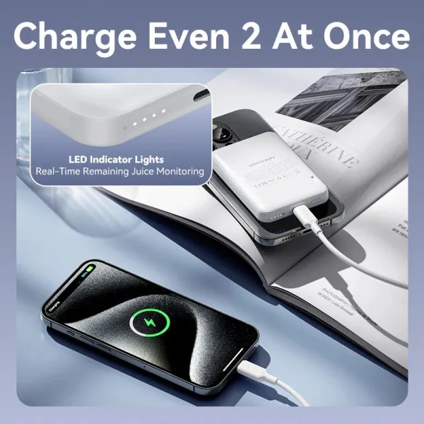 Vention Magnetic Wireless 5000mAh 20W PD забезпечує швидку і безпечну зарядку пристроїв, що підтримують стандарт Qi. Магнітна зарядна пластина з силою фіксації 12N надійно утримує смартфон навіть у чохлі, гарантуючи стабільне з'єднання під час зарядки. Бездротова потужність до 15 Вт дозволяє ефективно поповнювати заряд без використання кабелів, роблячи процес максимально комфортним для повсякденного використання.