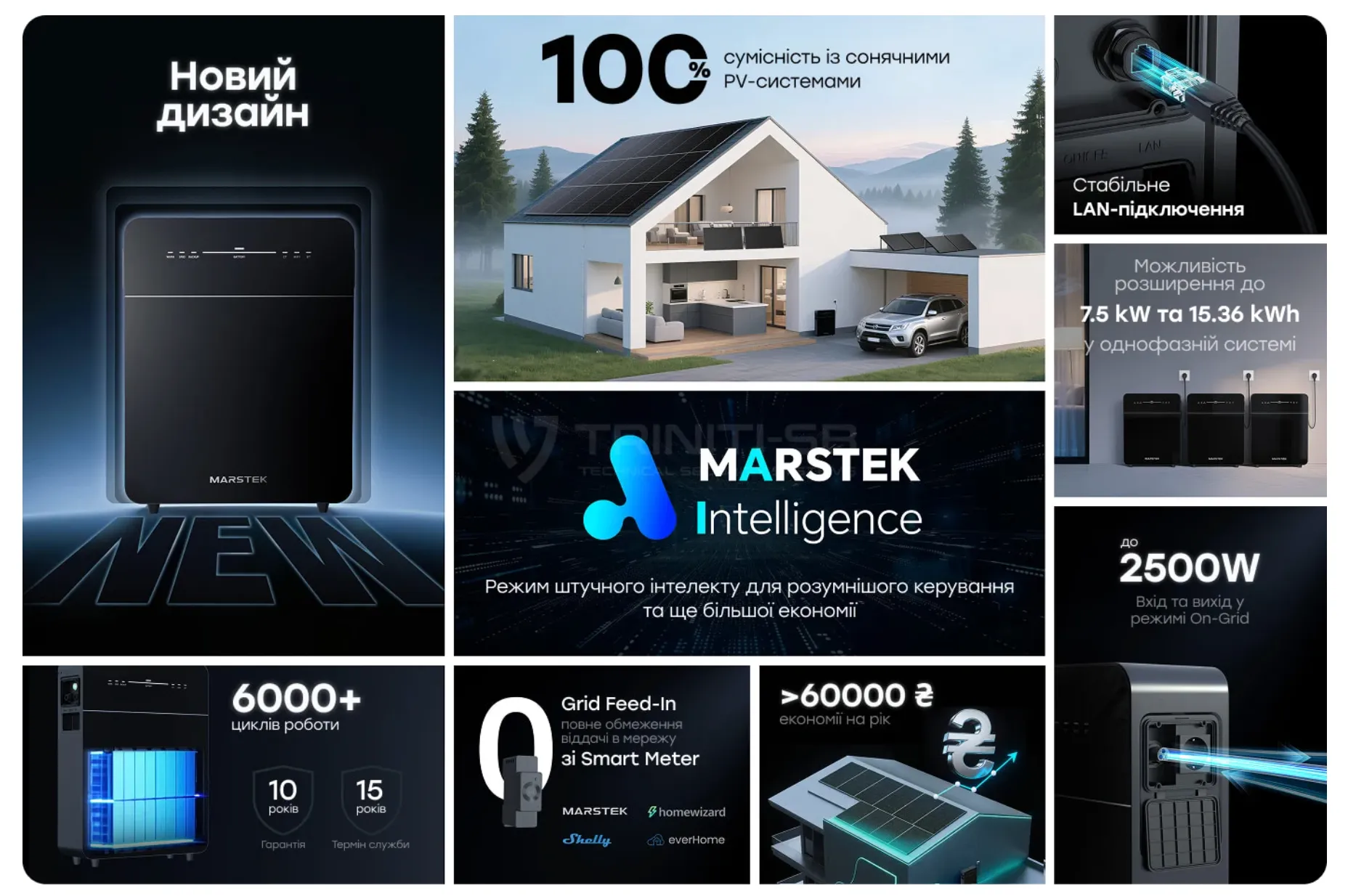 Пристрій ідеально сумісний з будь-якими сонячними панелями, запобігає зворотному потоку енергії в мережу та гарантує повне самовикористання, що допомагає максимально економити кошти завдяки алгоритмам штучного інтелекту. Підтримка розумних лічильників від виробника та інших брендів дозволяє точно моніторити споживання. Система підходить для резервного живлення всього будинку в однофазному або трифазному виконанні з можливістю паралельного з'єднання до трьох блоків на фазу для досягнення загальної потужності до 22,5 кВт та ємності 46,08 кВт·год.
