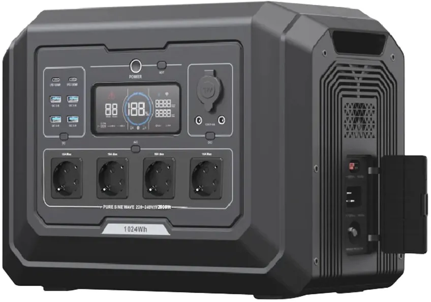 Станція дозволяє одночасно підключати до 13 пристроїв через AC-, USB-A, USB-C та DC-порти. Вбудована LiFePO4 батарея на 1024 Вт·год забезпечує тривалий ресурс і високу безпеку, а режим EPS гарантує безперервне живлення під час відключень. Керування та моніторинг через мобільний застосунок Bluetooth/WiFi і інформативний LCD-дисплей забезпечують повний контроль у реальному часі.