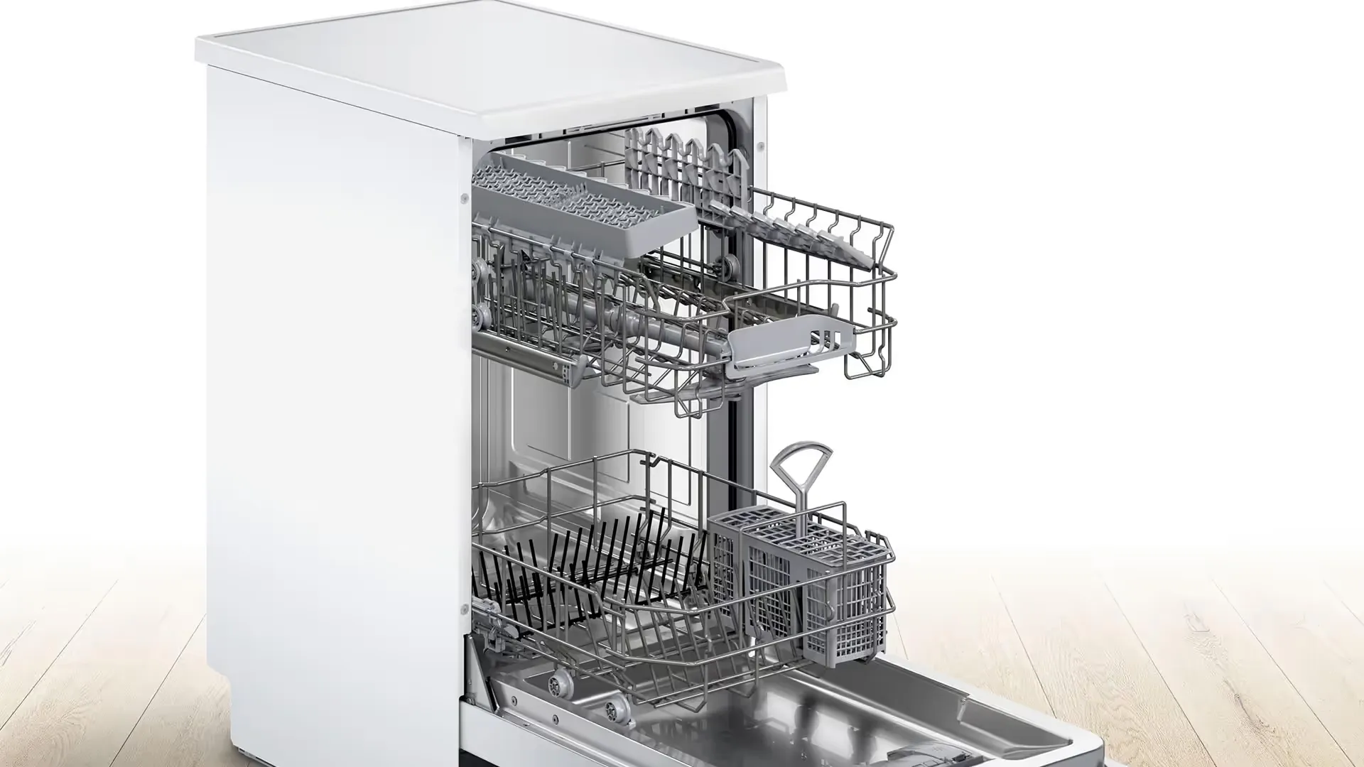 Bosch SPS2IKW55K — це вузька посудомийна машина шириною всього 45 см, яка ідеально підходить для невеликих кухонь, зберігаючи при цьому функціональність повнорозмірних моделей. Вона вміщує до 10 комплектів посуду, забезпечуючи ідеальний результат миття. Інверторний двигун EcoSilence Drive гарантує надійну, тиху та енергоефективну роботу при рівні шуму всього 48 дБ. Економна витрата води — всього 9,5 літрів на цикл — дозволяє дбати про екологію та сімейний бюджет.