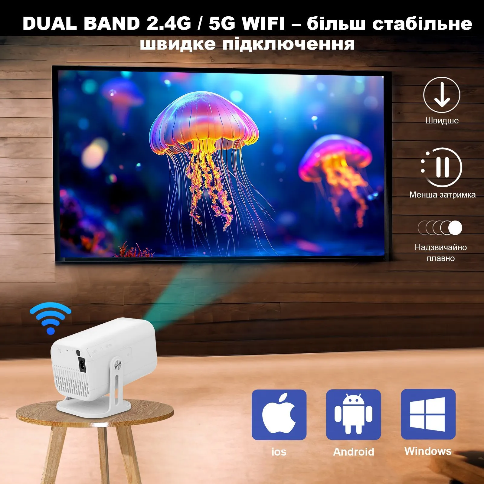 Проектор оснащений DUAL BAND 2.4G / 5G Wi-Fi, що забезпечує більш стабільне і швидке бездротове підключення. Ви отримуєте плавну трансляцію, меншу затримку і надійний зв'язок навіть при перегляді фільмів у високій роздільній здатності, онлайн-ігор або презентацій. Проектори V1 легко працюють з iOS, Android і Windows, дозволяючи зручно транслювати контент прямо зі смартфона, планшета або ноутбука.