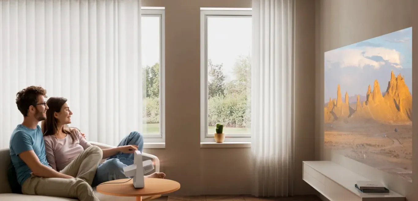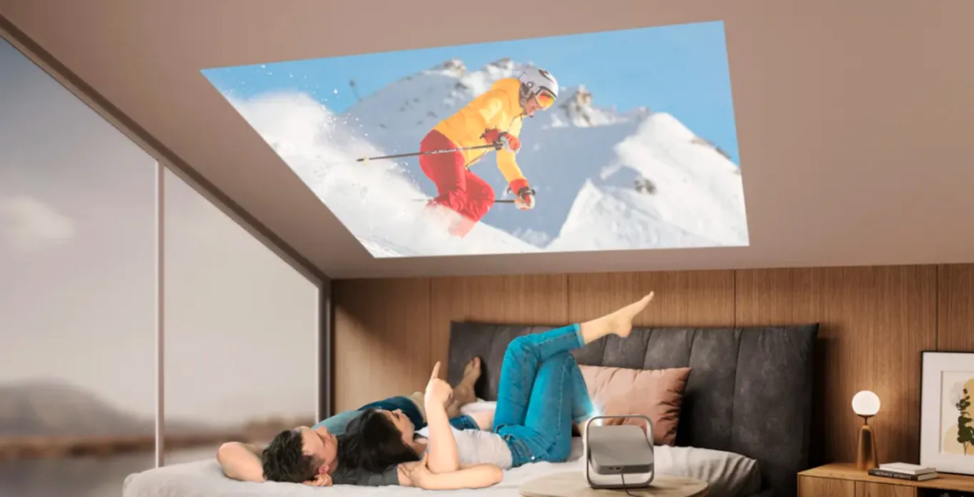 Однією з основних переваг XGIMI Elfin Flip є можливість проекції під різними кутами в межах 150, зокрема на стелю, що дає можливість переглядати контент навіть лежачи. Ця функція значно підвищує зручність використання пристрою в домашніх умовах. Автоматичне фокусування та корекція спотворень забезпечують чітке та правильне відображення картинки на будь-якій поверхні. Більше не потрібно турбуватися про ручні налаштування – проектор самостійно визначить необхідні параметри для максимально якісного зображення.