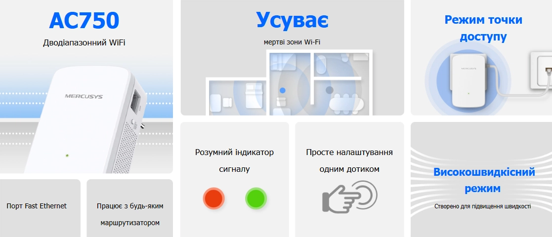 Налаштувати роботу пристрою дуже просто — достатньо натиснути лише одну кнопку WPS. Уже за кілька секунд зона покриття Wi-Fi стане ширшою, а доступ до інтернету з’явиться у важкодоступних місцях.