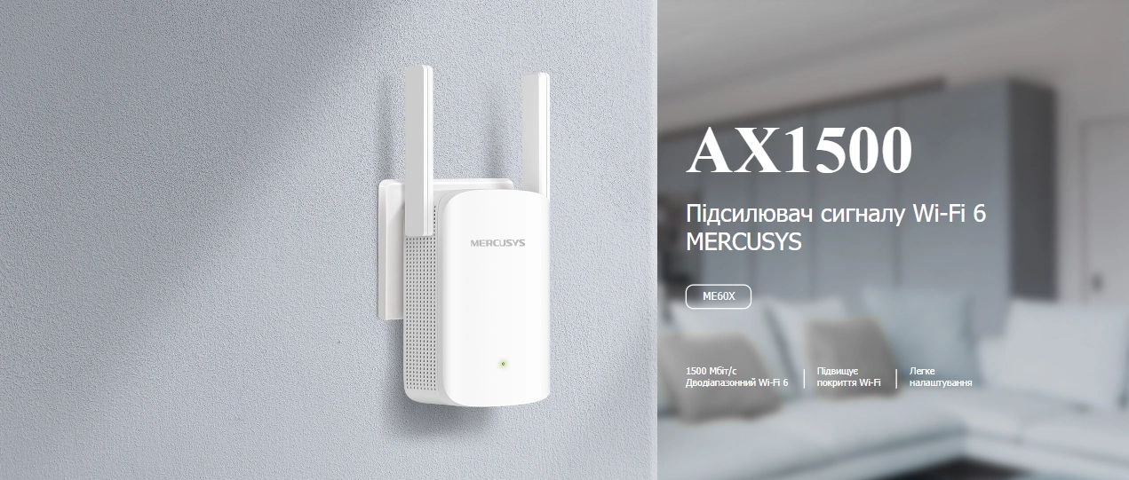 Mercusys ME60X — це новітній підсилювач сигналу Wi-Fi 6, який забезпечує сумарну швидкість передачі даних до 1500 Мбіт/с. На частоті 5 ГГц пристрій працює зі швидкістю до 1201 Мбіт/с, а на 2,4 ГГц — до 300 Мбіт/с. Такі показники гарантують комфортну роботу з потоковим відео, онлайн-іграми та великими файлами.