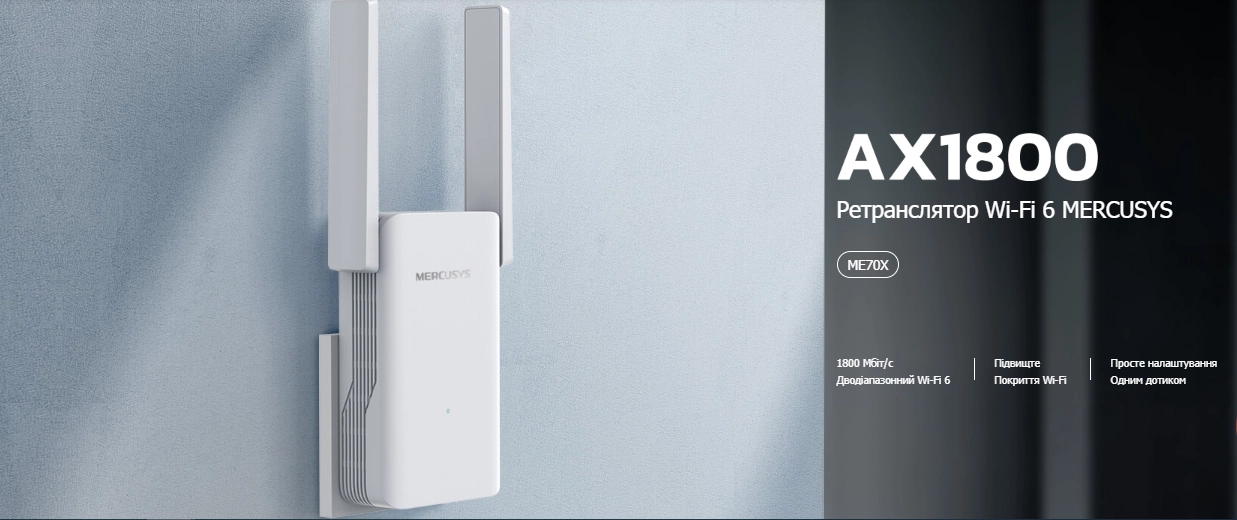 ME70X — це сучасний розширювач сигналу Wi-Fi 6 AX1800, що забезпечує швидкість передавання даних до 1800 Мбіт/с. Пристрій працює одночасно у двох діапазонах: 1201 Мбіт/с на частоті 5 ГГц та 574 Мбіт/с на частоті 2,4 ГГц, що дозволяє комфортно користуватися інтернетом як для роботи, так і для відпочинку.