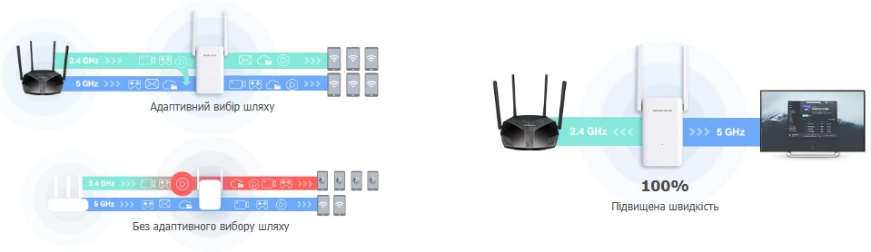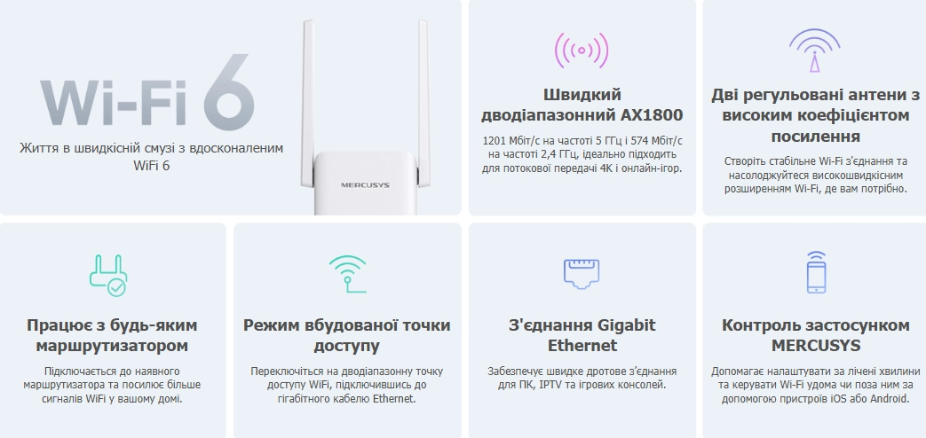 Для стабільного та швидкого дротового з’єднання розширювач оснащений гігабітним Ethernet-портом. Це рішення ідеально підходить для стаціонарних комп’ютерів, IPTV або ігрових консолей, де потрібна мінімальна затримка та максимальна швидкість передавання даних.