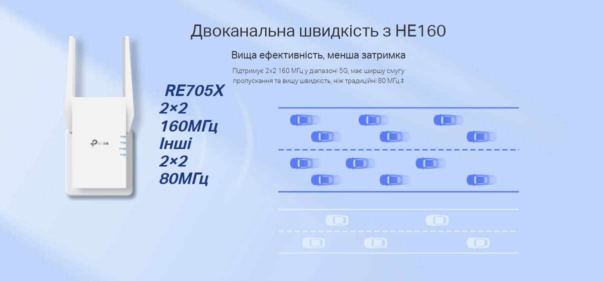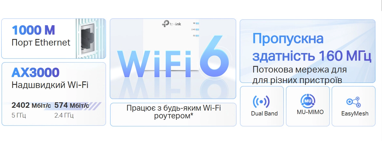 Сумісність із технологією EasyMesh дозволяє гнучко створювати Mesh-мережу, підключаючись до маршрутизатора, сумісного з EasyMesh. Це забезпечує безперервне покриття всього будинку та усуває «мертві зони» Wi-Fi, дозволяючи підключеним пристроям завжди використовувати найкращий канал передачі даних.