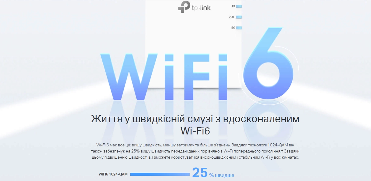 Дводіапазонний Wi-Fi зі швидкістю до 3,0 Гбіт/с дозволяє використовувати діапазони 5 ГГц із пропускною здатністю 2402 Мбіт/с та 2,4 ГГц із 574 Мбіт/с, що забезпечує високу швидкість передачі даних та велику пропускну здатність завдяки технології Wi-Fi 6. Така архітектура дозволяє ефективно розподіляти навантаження між користувачами та мінімізувати затримки під час передавання даних.