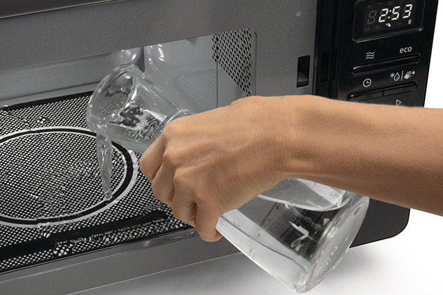 Налейте воду в миску, пригодную для микроволнового приготовления, поставьте в печь и включите программу AquaClean. Пар размягчит загрязнения на стенках камеры. После завершения программы протрите стенки влажной тканью.