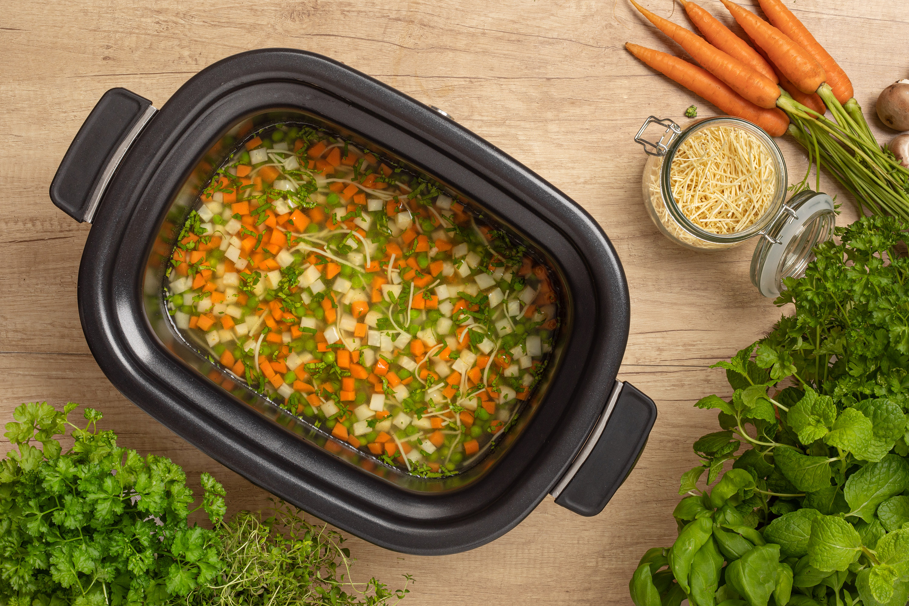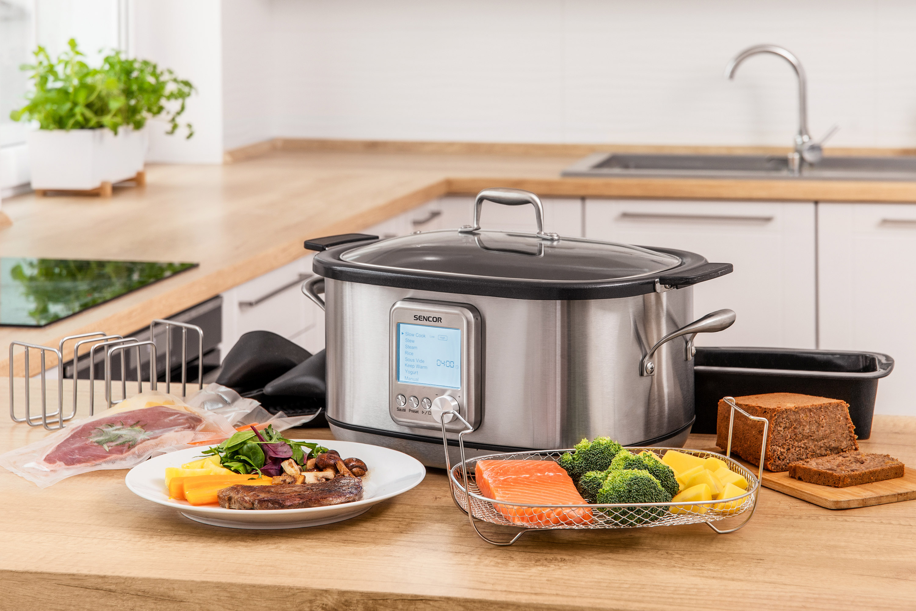 Большая паровая ёмкость из нержавеющей стали позволяет готовить рыбу, кнедлики и овощи на пару.