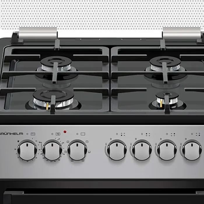 Комбинированная плита GRUNHELM F661234GB — это идеальный выбор для тех, кто ценит качество и функциональность. Это устройство сочетает в себе газовую варочную поверхность и электрическую духовку, что обеспечивает максимальное удобство в использовании. Варочная поверхность оборудована четырьмя газовыми конфорками различной мощности: первая конфорка имеет мощность 1000 Вт, вторая и третья — по 1750 Вт, а четвертая — 2850 Вт. Решетки изготовлены из чугуна, что гарантирует их долговечность и надежность. Покрытие поверхности выполнено из эмали, что упрощает ее очистку и уход.