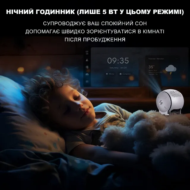 В режиме ночных часов он потребляет всего 5 Вт, даря мягкую подсветку и точное время. Проектор сопровождает спокойный сон, а утром помогает быстро сориентироваться в комнате после сна.