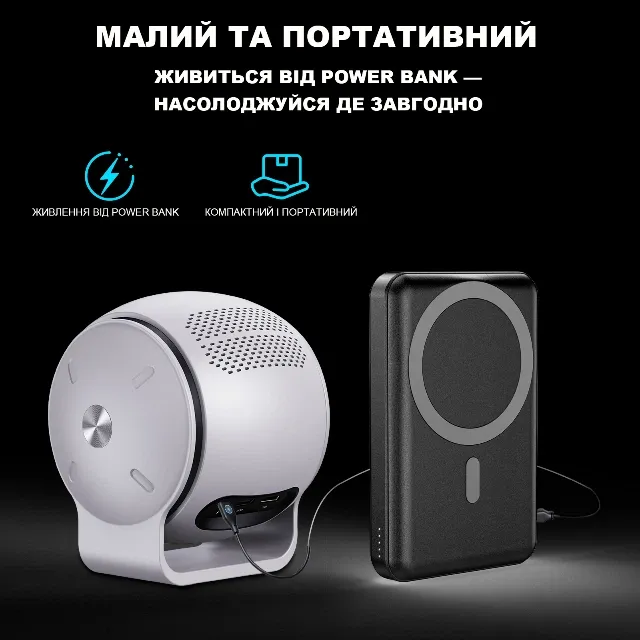 Компактный и легкий проектор, помещается в сумку или рюкзак. Благодаря питанию от Power Bank вы можете наслаждаться любимыми фильмами, играми или презентациями где угодно — дома, на природе или в путешествии.
