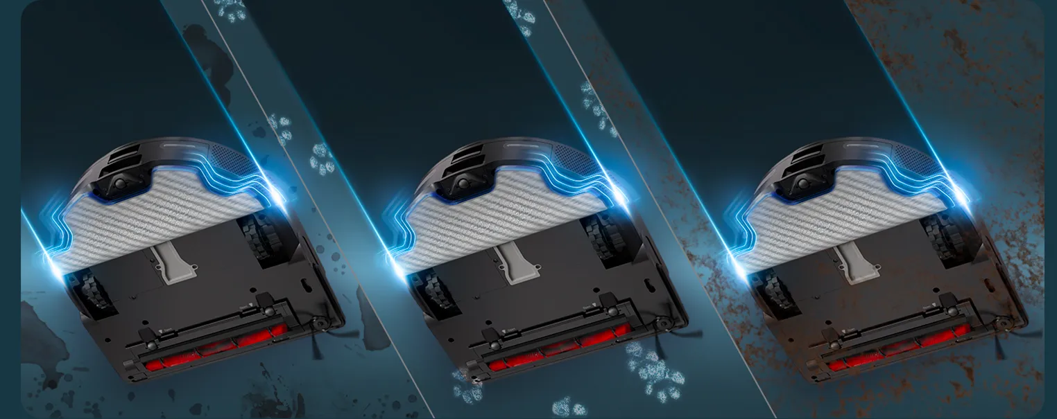 Вибрационная насадка эффективно оттирает пятна. Забудьте о ручной мойке пола после робота-пылесоса.