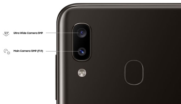 Galaxy A20 оснащен сверхширокоугольной камерой с углом обзора 123 градуса — таким же, как у человеческого глаза, и 13-мегапиксельной камерой (F1.9) для ярких и четких фотографий в любое время дня. А также в нем доступна 5-мегапиксельная камера глубины для регулировки глубины резкости.