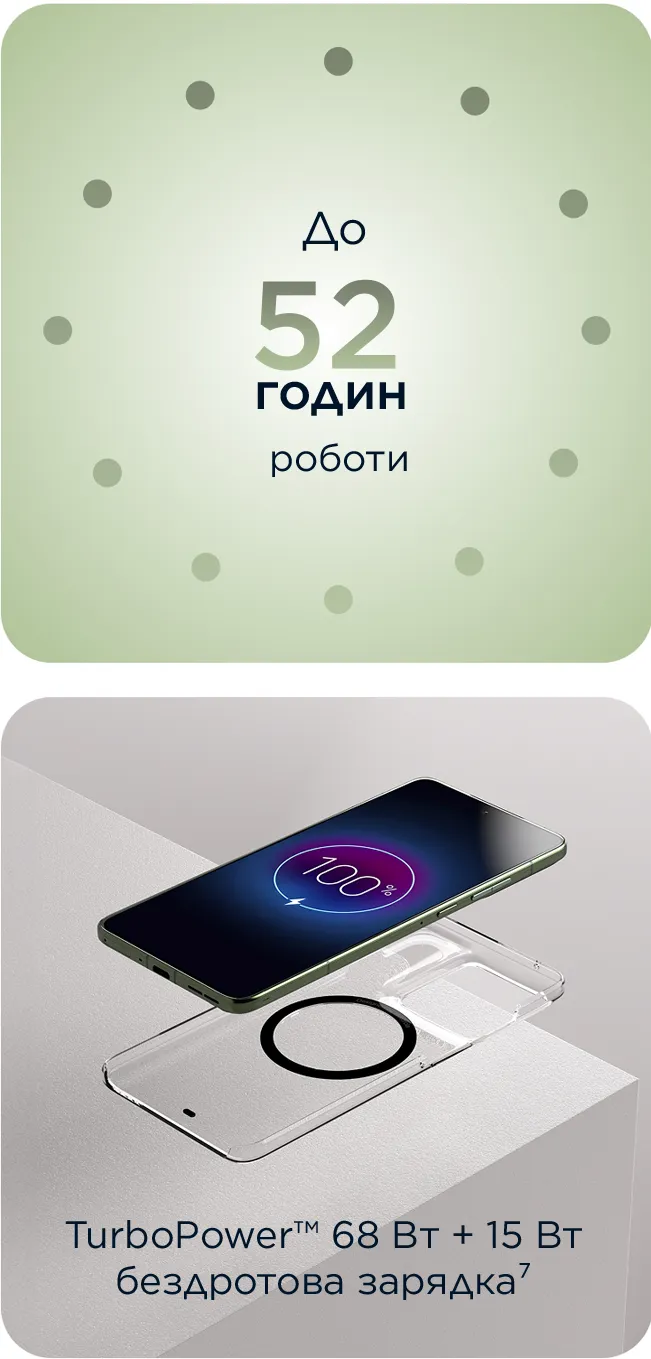 Потрібен бездротовий зарядний пристрій Motorola TurboPower™ потужністю 68 Вт (продається окремо).