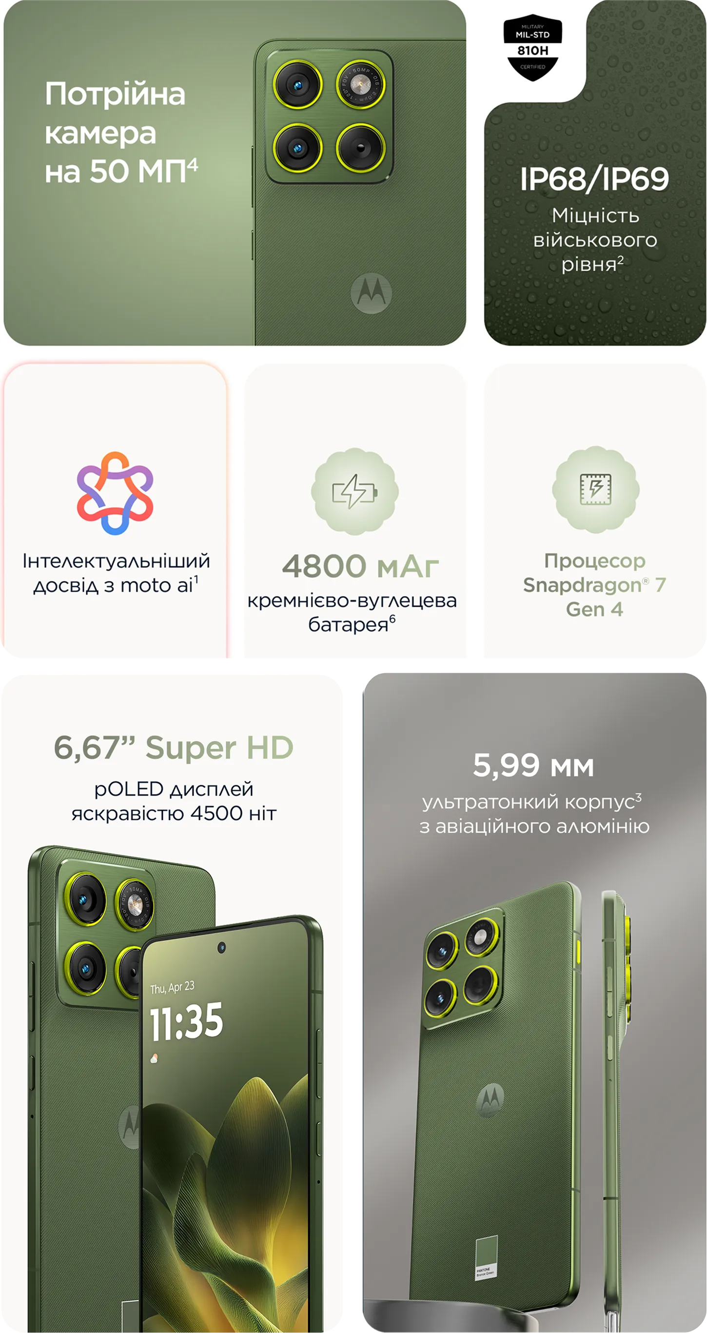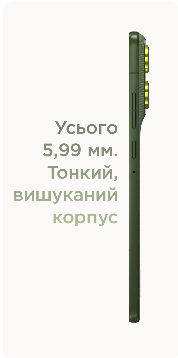 При товщині всього 5,99 мм motorola edge 70 є найтоншим смартфоном у своєму класі3. Він виконаний із авіаційного алюмінію, захищений склом Gorilla® Glass 7i та має ступінь захисту IP68/IP692.