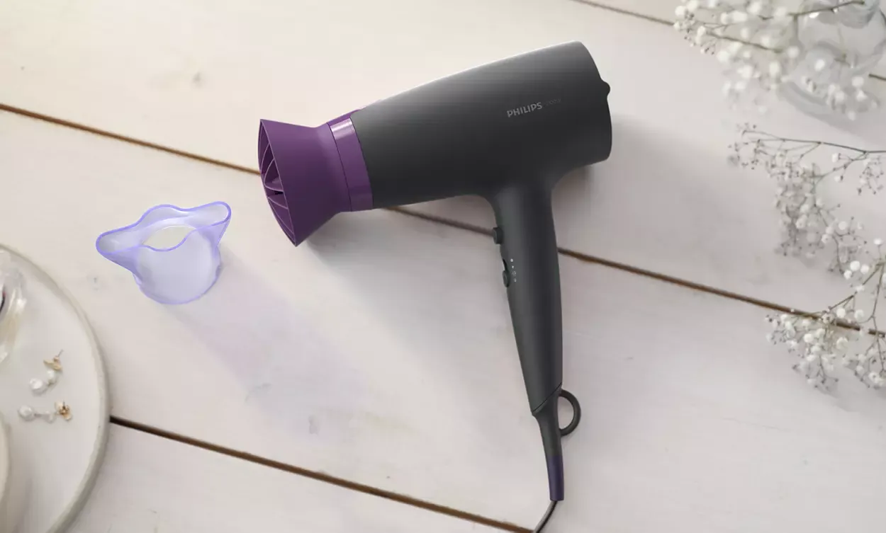 Мощная сушка при более низкой температуре с насадкой ThermoProtect; Насадка ThermoProtect уникальной конструкции мощно смешивает теплый и холодный воздух для ежедневного ухода; Усовершенствованная ионизация для блестящих и послушных волос; Настройка холодного воздуха для довершения прически