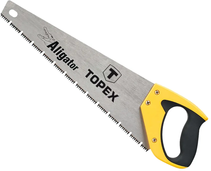 TOPEX представляє ножівку Aligator, призначену для ефективного розпилювання деревини. Інструмент має тристороннє заточування і загартування зубів, що значно знижує опір різання і полегшує розпилювання вздовж волокон деревини. З кроком у 7 зубів на дюйм, ножівка забезпечує більш ефективну роботу. Відмінною особливістю цієї моделі є спеціальна конструкція, що забезпечує швидке та зручне розпилювання. Ергономічна двокомпонентна ручка ножівки полегшує точне ведення інструменту, а антиковзне покриття запобігає вислизанню з руки, забезпечуючи високий комфорт роботи.