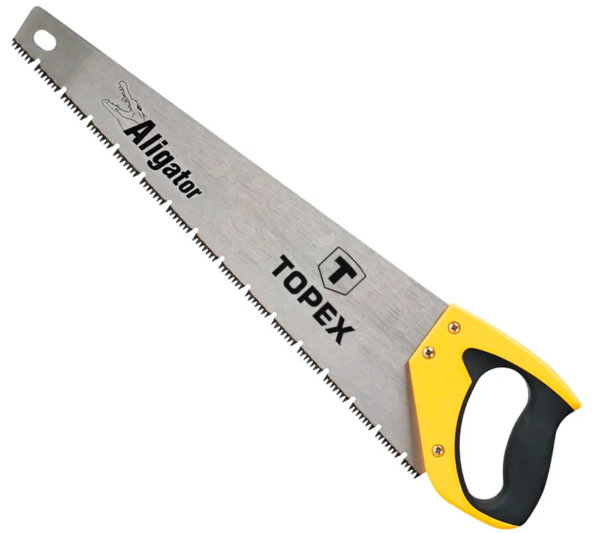 TOPEX представляє ножівку Aligator, призначену для ефективного розпилювання деревини. Інструмент має тристороннє заточування і загартування зубів, що значно знижує опір різання і полегшує розпилювання вздовж волокон деревини. З кроком у 7 зубів на дюйм, ножівка забезпечує більш ефективну роботу. Відмінною особливістю цієї моделі є спеціальна конструкція, що забезпечує швидке та зручне розпилювання. Ергономічна двокомпонентна ручка ножівки полегшує точне ведення інструменту, а антиковзне покриття запобігає вислизанню з руки, забезпечуючи високий комфорт роботи.