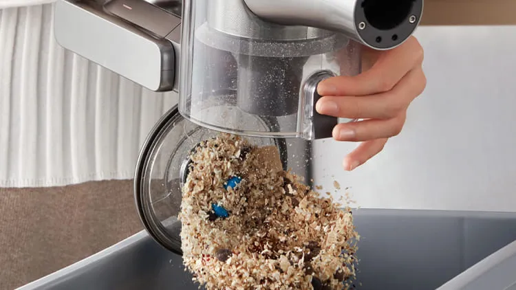 Контейнер для збирання пилу та бруду легко випорожнюється одним натисканням, що забезпечує видалення зібраного сміття найлегшим способом. Завдяки місткому пилозбірнику об'ємом 0.6 л забезпечує максимально якісне та тривале прибирання кожного куточка Вашої оселі.