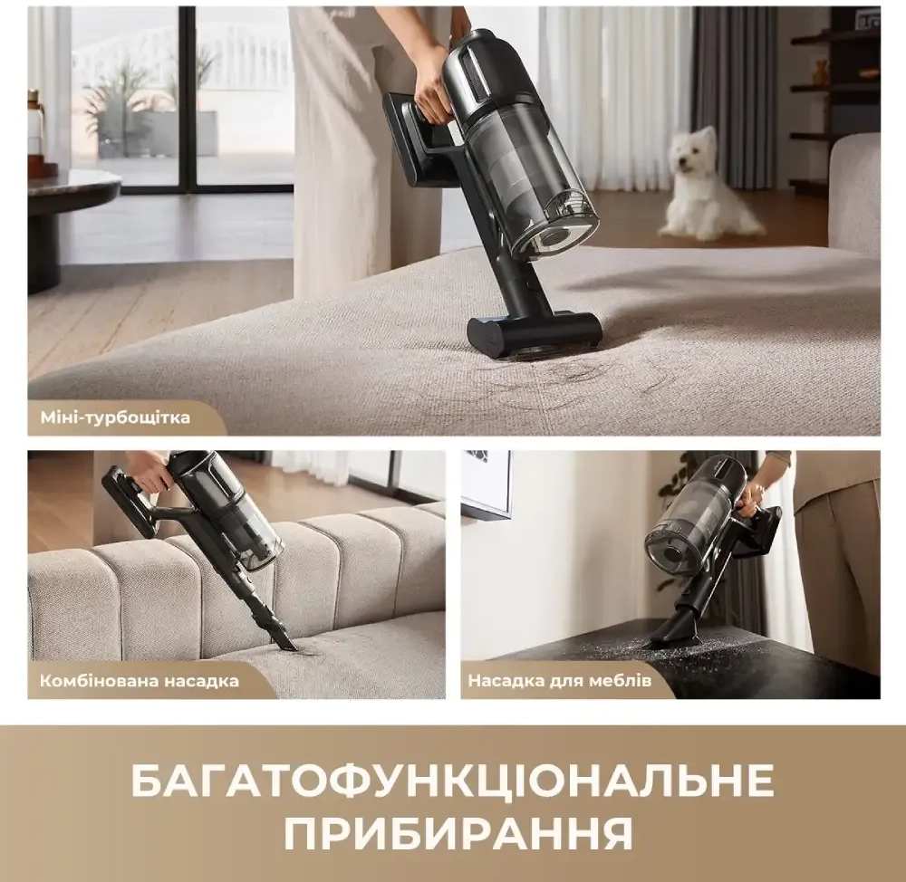 Кожна насадка вирішує своє завдання, а разом вони роблять R20 Ultra багатофункціональним інструментом для прибирання всього будинку — від підлоги до найвищих полиць.