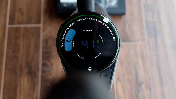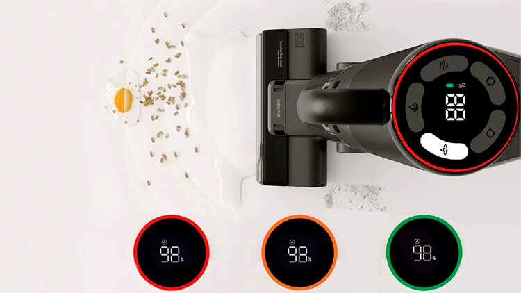 Під час сеансу бездротовий пилосос аналізує, наскільки складні плями та бруд, з якими він стикається на дорозі. І головна фішка в тому, що це дозволяє автоматично вибирати потужність для різних завдань. А ще за індикаторним кільцем на екрані ви зможете зрозуміти рівень забрудненості тієї чи іншої поверхні. Так, червоний колір свідчить про складне забруднення. Помаранчевий – сигналізує про середній рівень. А якщо побачите зелене коло – значить у девайса на шляху легке засмічення.