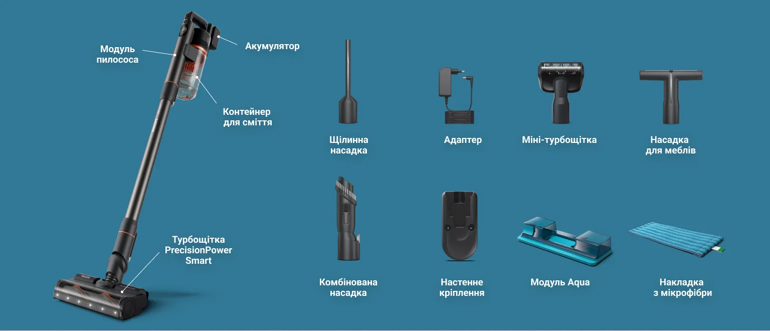 1Внутрішній технічний тест, у порівнянні з іншими пилососами, представленими в Україні, 2022 р. За середнім значенням результатів, за різними типами бруду, підлоги та, якщо застосовано, аксесуар для води, що входить у комплект, завдяки комбінованим властивостям продукту. 2На твердих підлогах у турборежимі. 3Режим Eco, лише насадка. 4На твердих підлогах у турборежимі. 5Завдяки прибиранню з додаванням мийного засобу.