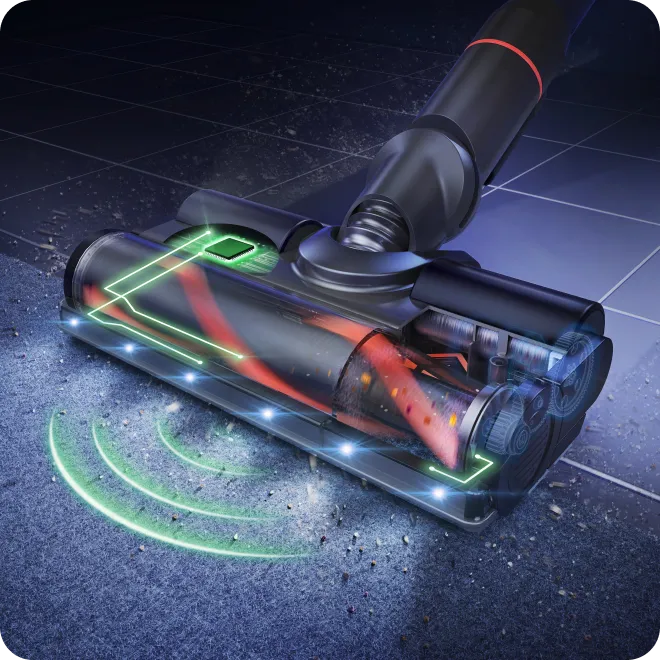 Автоматично регулює потік повітря і швидкість обертання щітки для оптимальної роботи на твердій підлозі та з килимом.