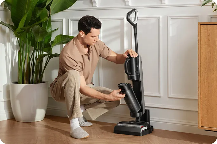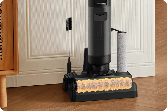 Коли ви перестали прибирати у своїй квартирі потрібно лише встановити пилосос на комплектну станцію, яка заряджає девайс, очищає робочий валик від бруду та пилу. Вам потрібно лише подбати про те, щоб бак із чистою водою був сповнений. Після самоочищення пилосос сам висушить ролик та підготує пилосос до наступного використання. Перед тривалим зберіганням та заряджанням рекомендується спустошити бак для збору брудної води та сміття. Достатньо лише вилити вміст в унітаз, прополоскати контейнер водою та встановити у корпус пилососа.