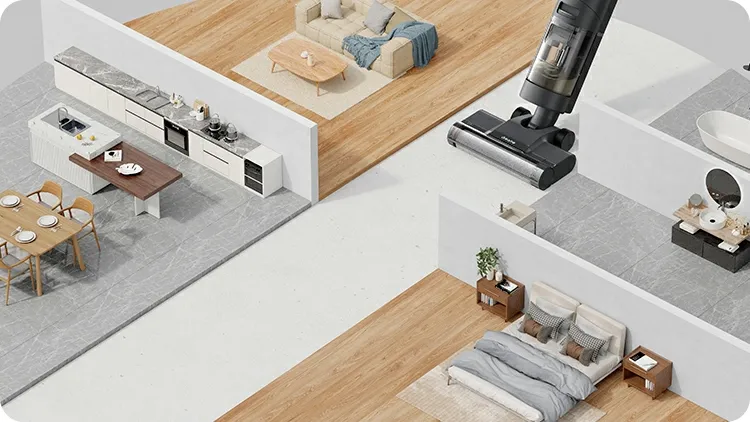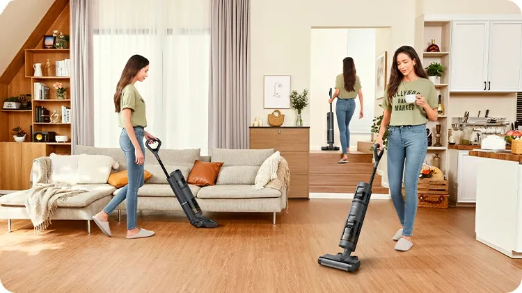 Перемикайте режими прибирання одним натисканням. Залежно від типу покриття підлоги ви можете використовувати сухе чищення або вологе прибирання. Вологе прибирання підійде для твердих покриттів, таких як плитка, ламінат, паркет або лінолеум. Сухе чищення - для м'яких та килимових покриттів.