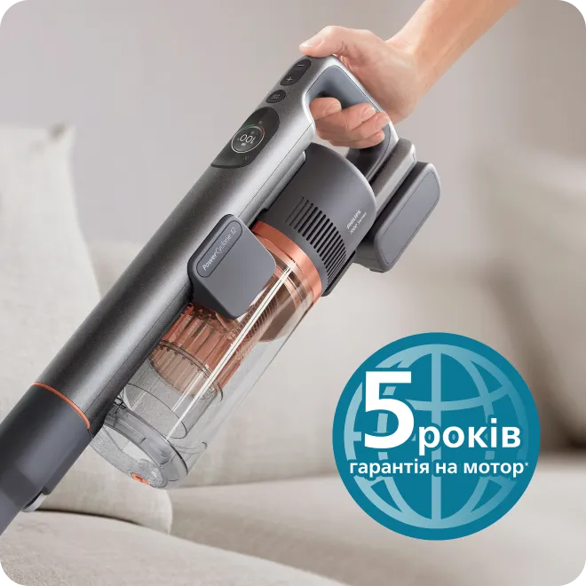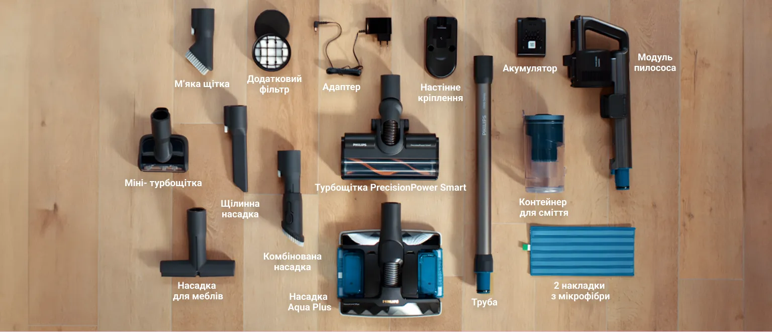 1Внутрішній технічний тест, у порівнянні з іншими пилососами, представленими в Україні, 2022 р. За середнім значенням результатів, за різними типами бруду, підлоги та, якщо застосовано, аксесуар для води, що входить у комплект, завдяки комбінованим властивостям продукту. 2На твердих підлогах у турборежимі. 3Режим Eco, лише насадка. 4На твердих підлогах у турборежимі. 5Завдяки прибиранню з додаванням мийного засобу.