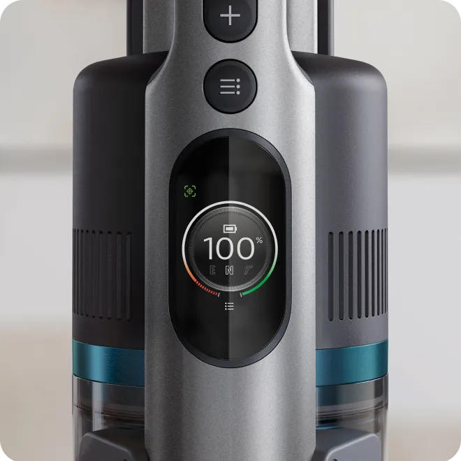 Відображає рівень заряду акумулятора, обраний режим прибирання (еко, стандартний, турбо), рівень підсвітки, використання Smart-режиму, а також вказує на необхідність заміни фільтру.