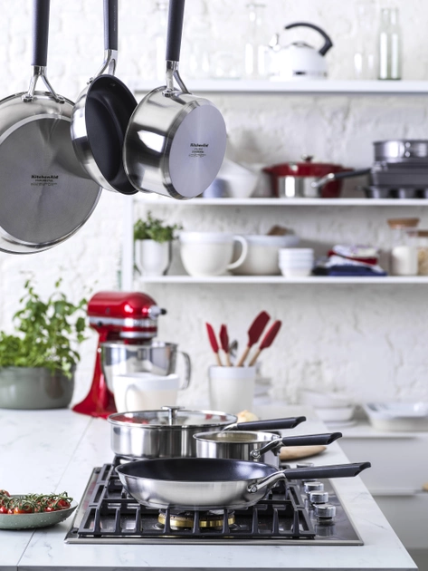 Інноваційна колекція KitchenAid Classic Stainless Steel поєднує в собі надійне індукційне дно з нержавіючої сталі з алюмінієвим сердечником, що забезпечує рівномірний розподіл тепла на будь-якій плиті. Цей унікальний посуд має керамічне антипригарне покриття, що полегшує витяг їжі, а також вигнуті краї для наливання без крапель. Кришки із загартованого скла дають змогу контролювати процес приготування, не відкриваючи їх. Завдяки ручці Stay-Cool ви отримаєте надійне захоплення і зможете використовувати посуд у духовці за температури до 160°C, забезпечуючи максимальну зручність і функціональність. Проста в догляді - легко мити вручну, також можна мити в посудомийній машині.