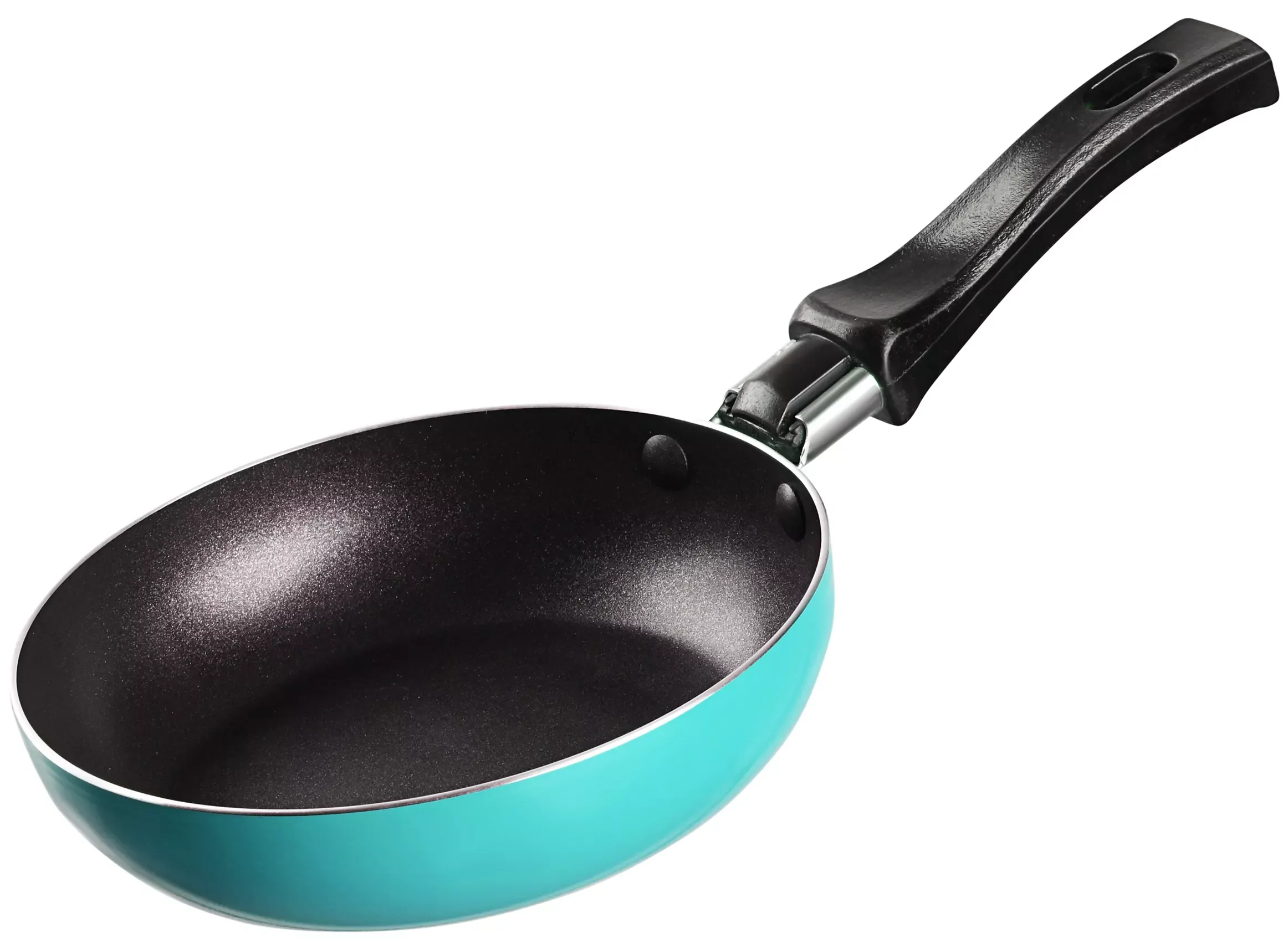 Компактна сковорода діаметром 14 см виготовлена з кованого алюмінію і призначена для використання на газових, електричних, склокерамічних і галогенних плитах. Сковорода блакитного кольору. Має антипригарне покриття та зручну бакелітову ручку. Висота - 38 мм, товщина дна і стінок - 1,8 мм.