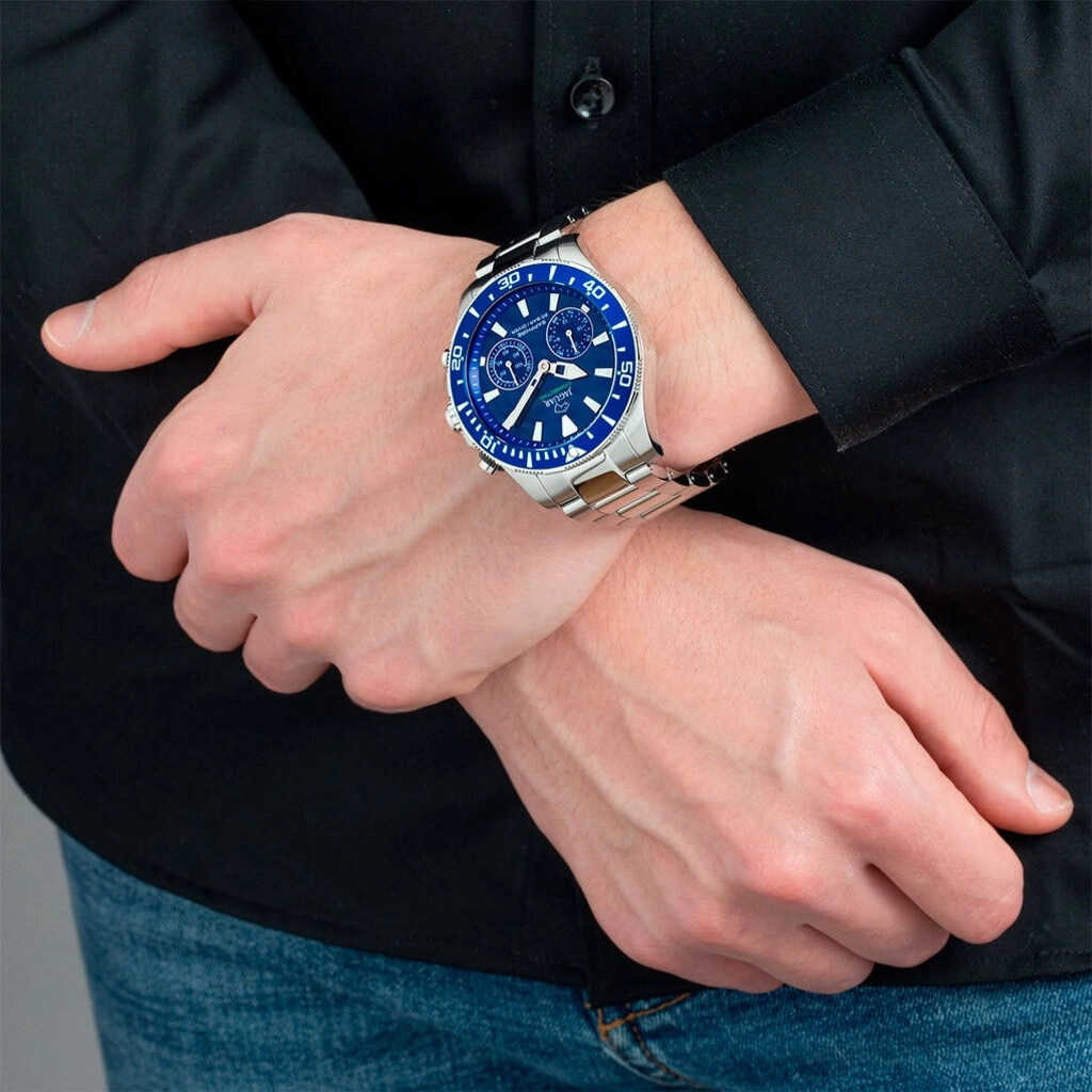 Годинник Jaguar Connected J888 — це ідеальний баланс між класичним дизайном і сучасними функціями. Його аналоговий циферблат з обертовим безелем підкреслює преміальний стиль, а корпус з нержавіючої сталі та сапфірове скло забезпечують виняткову міцність. Вбудовані датчики крокоміра й акселерометра допоможуть відстежувати активність, а синхронізація зі смартфоном відкриє доступ до зручних функцій: управління камерою і музикою, відхилення дзвінків, вібробудильника і пошуку телефону. З вражаючою водонепроникністю 200 WR годинник готовий до будь-яких пригод, навіть під водою. А завдяки автономності до 2 років вам не доведеться турбуватися про регулярну підзарядку. Краса та функціональність в одному пристрої!