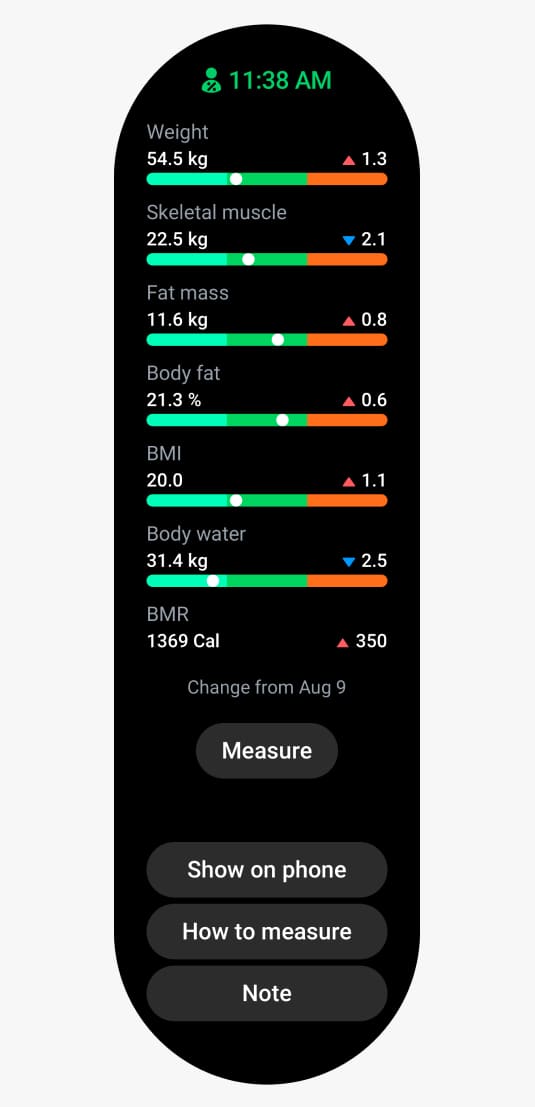 Відстежуйте зміни свого фізичного стану з нашим першим смартгодинником, який здатен аналізувати склад тканин організму. Ви одразу дізнаєтеся процентний розподіл жиру, скелетних м’язів, води та інші показники, аби коригувати свої фітнес-програми. Система Samsung BioActive Sensor і наш найшвидший чип привнесли найбільші інновації в лінійку Galaxy Watch.², ³, ⁴, ⁵, ⁶, ⁷