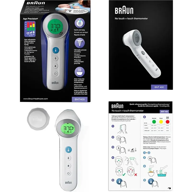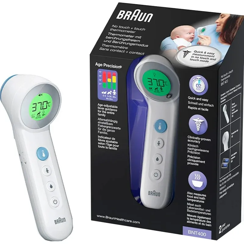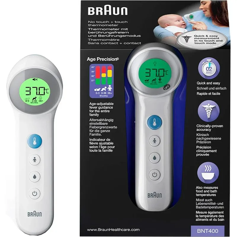 Braun BNT400 володіє запатентованою технологією Age Precision, яку усуває похибку вимірювання температури, залежно від віку дитини чи дорослого. Також ви можете визначати температуру контактним та безконтактним способом. Термометр має спеціальний режим, який дозволяє вимірювати температуру їжі, напоїв або навіть ванни для вашого малюка.