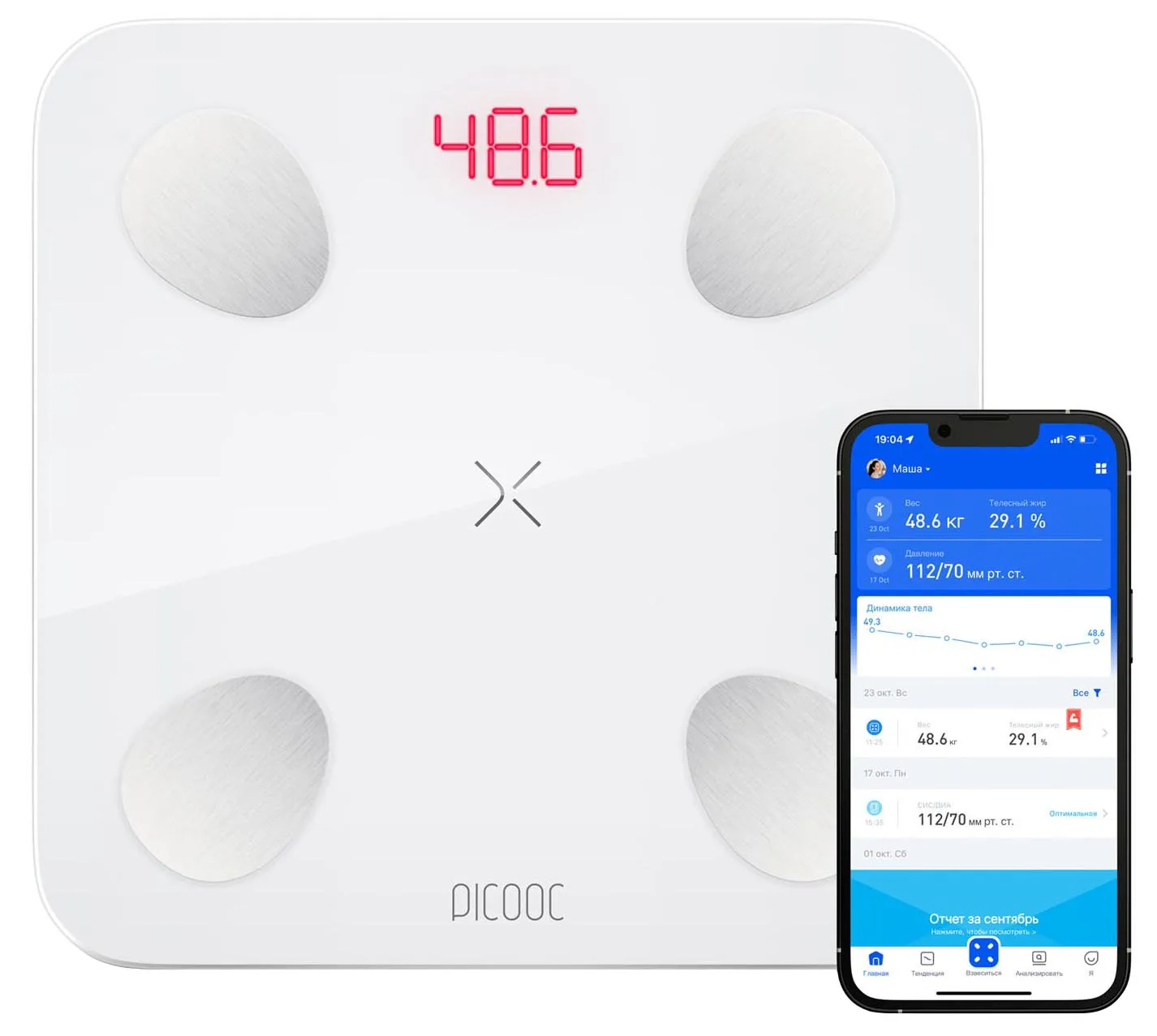 Picooc Mini Lite з'єднуються зі смартфоном через Bluetooth. Всі зміни автоматично зберігаються у програмі Picooc. Дані доступні у вигляді історії, наочних графіків та детальної статистики. Про кожен з параметрів можна прочитати докладніше, а завдяки кольоровим підказкам ви відразу побачите, які з ваших показників знаходяться в здоровому діапазоні. Поставте в додатку мету — набір маси, схуднення або підтримання форми — і отримуйте корисні поради для її досягнення. Кожен вимір супроводжується порадою від Розумного помічника: на що звернути увагу та як можна покращити свою форму.
