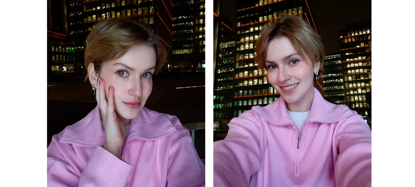 Фронтальна камера високої чіткості з широкою апертурою у поєднанні з AI-алгоритмами інтелектуально зменшує шум та точно відновлює текстуру шкіри й природні тони, роблячи нічні знімки ще захопливішими.