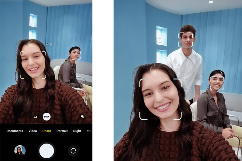 Фронтальна камера може інтелектуально визначати кількість людей у кадрі, а потім автоматично підлаштовуватися під кращий кадр, перемикаючись між 1-кратним, 0,8-кратним і 0,6-кратним зумом. Крім того, кут огляду об'єктива становить 100 градусів, що ідеально підходить для групових селфі у будь-який час.