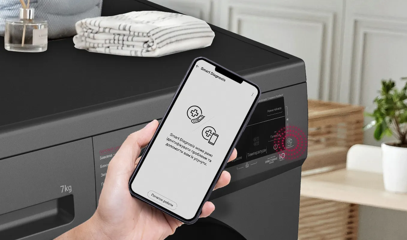 Функція мобільної діагностики Smart Diagnosis™ знаходить збої в роботі та виявляє внутрішні несправності машини. Отримана інформація швидко передається до сервісного центру. Щоб активувати Smart Diagnosis™, потрібно лише встановити програму LG ThinQ™ на Ваш смартфон.