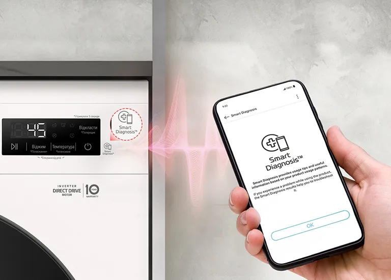 Smart Diagnosis™ дозволяє з легкістю виявити можливі несправності в роботі пральної машини. Щоб активувати Smart Diagnosis™, потрібно встановити та використовувати програму LG ThinQ™** на вашому смартфоні.