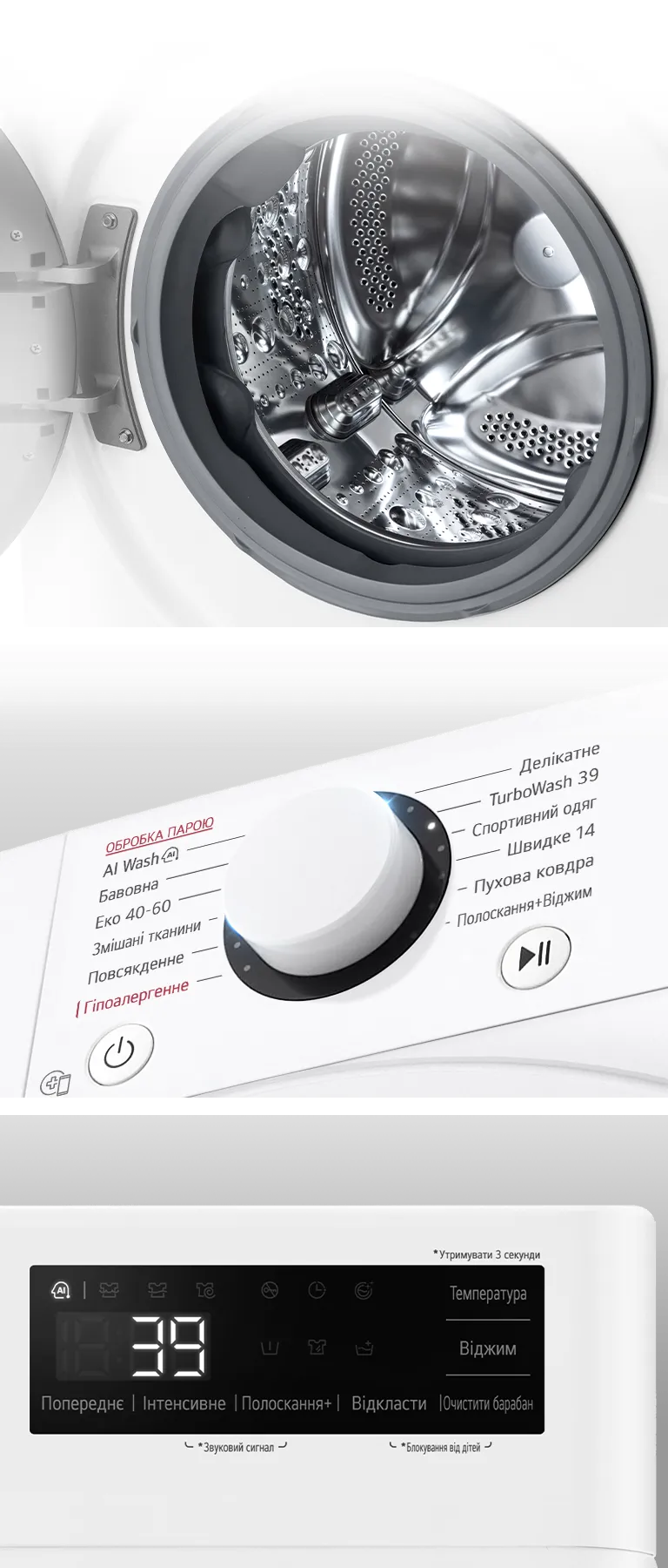 AI DD працює на 3 програмах прання: «Бавовна», «Змішані тканини», «Повсякденне прання».